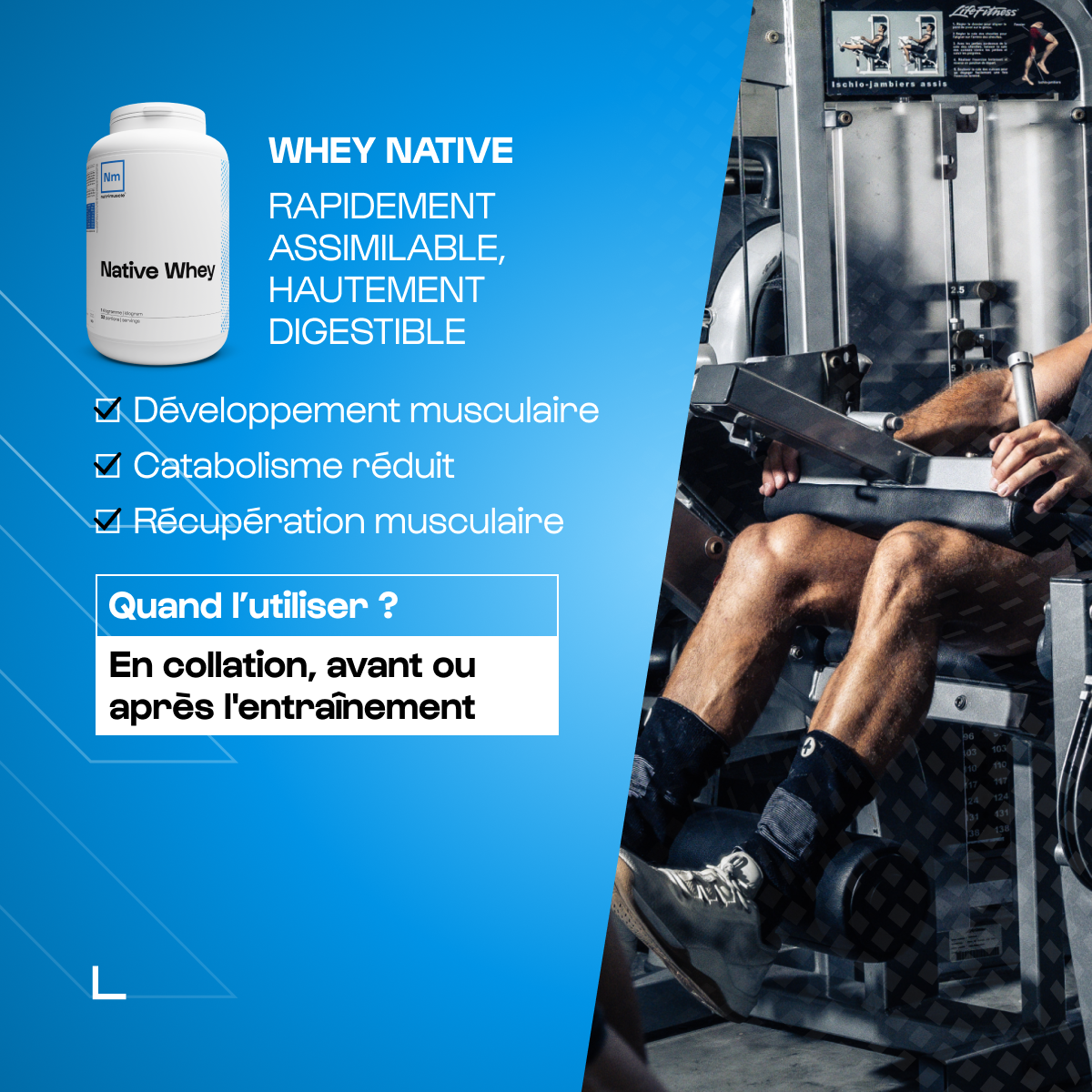 La Whey Native est un concentrat qui est directement issu du lait de vache. Grâce à un processus de microfiltration céramique à froid, la qualité nutritionnelle de la Whey Native Nutrimuscle est garantie, tout comme sa rapidité d’assimilation. Cette protéine contribue au maintien et à l'augmentation de la masse musculaire.