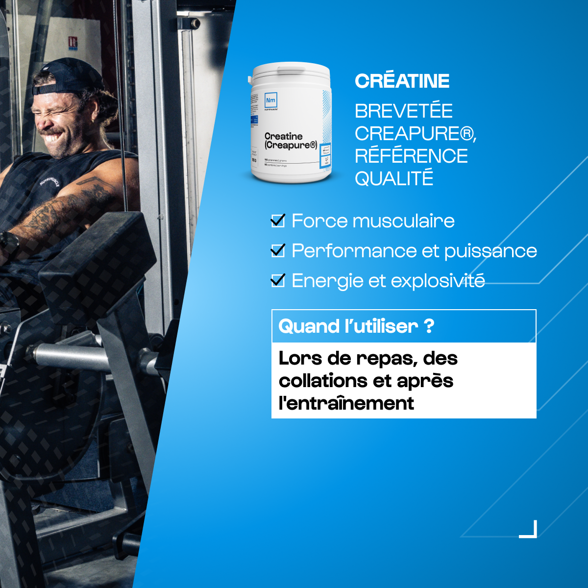 La créatine est un dérivé d’acide aminé qui est naturellement présent dans le corps. Sous forme de complément, elle permet d’augmenter votre énergie, votre force et contribue à augmenter votre masse musculaire. La prise régulière de créatine favorise également une meilleure récupération musculaire.