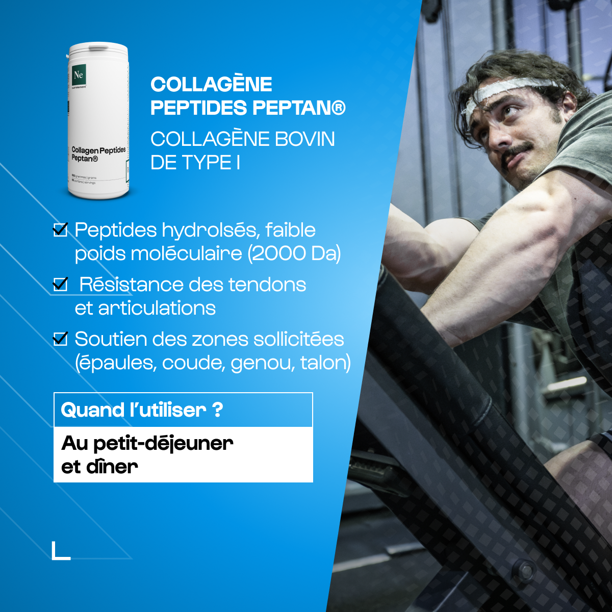 Il est préférable de fractionner la prise du Collagène Peptides Peptan® 1 Nutrimuscle, deux fois par jour (le matin et le soir).