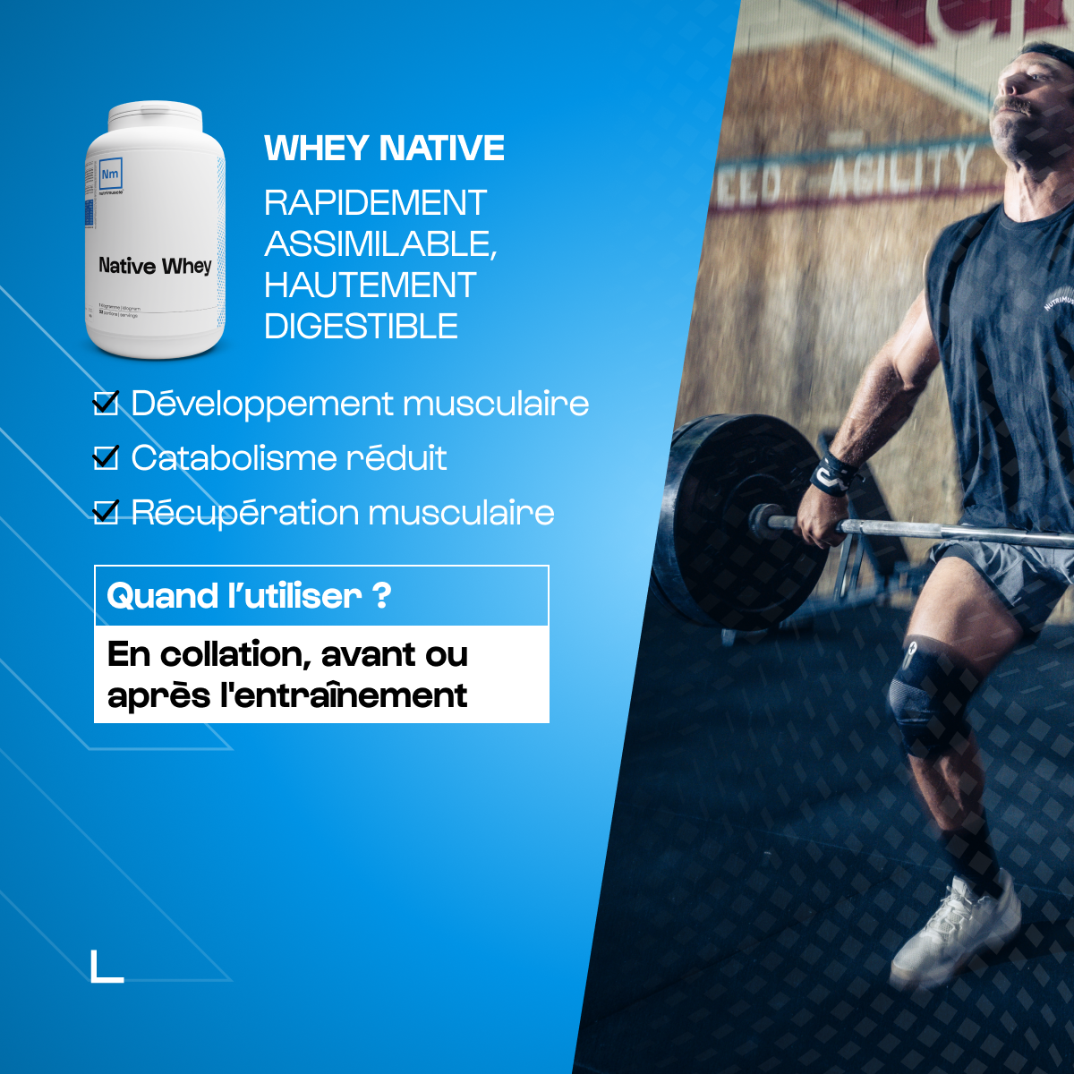Whey Native : Diluer 40 g dans 25 cl de lait ou d’eau. 30 minutes avant ou après votre entraînement, ou en collation.