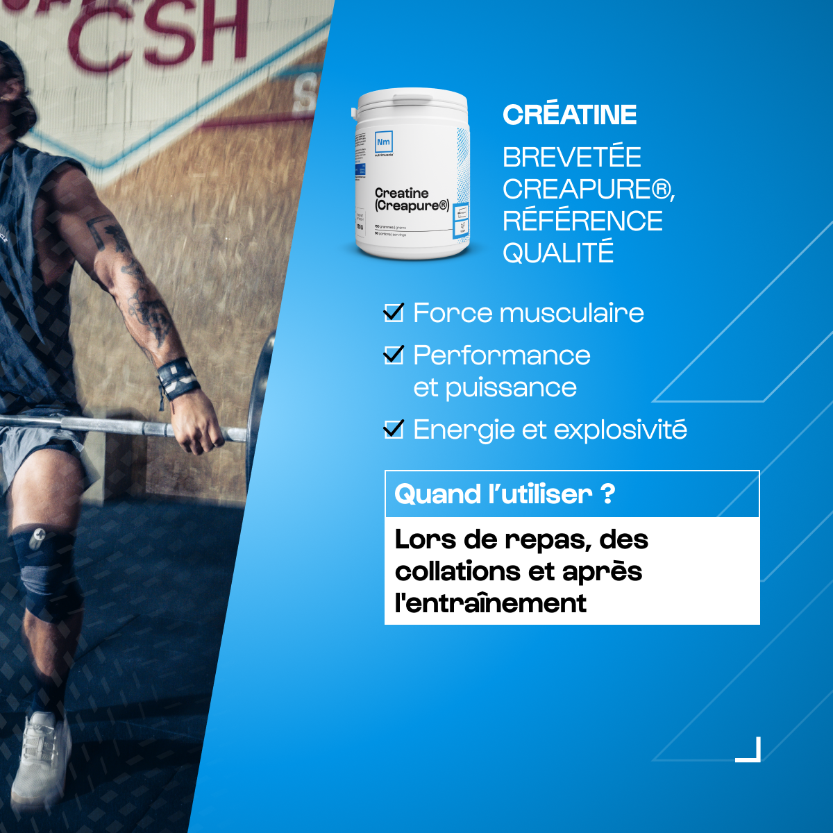 Créatine : Prendre 3 g par jour répartis dans la journée, aux repas, collations et immédiatement après l’effort ou l’entraînement : 1 à 2 g par prise avec des glucides et des protéines.