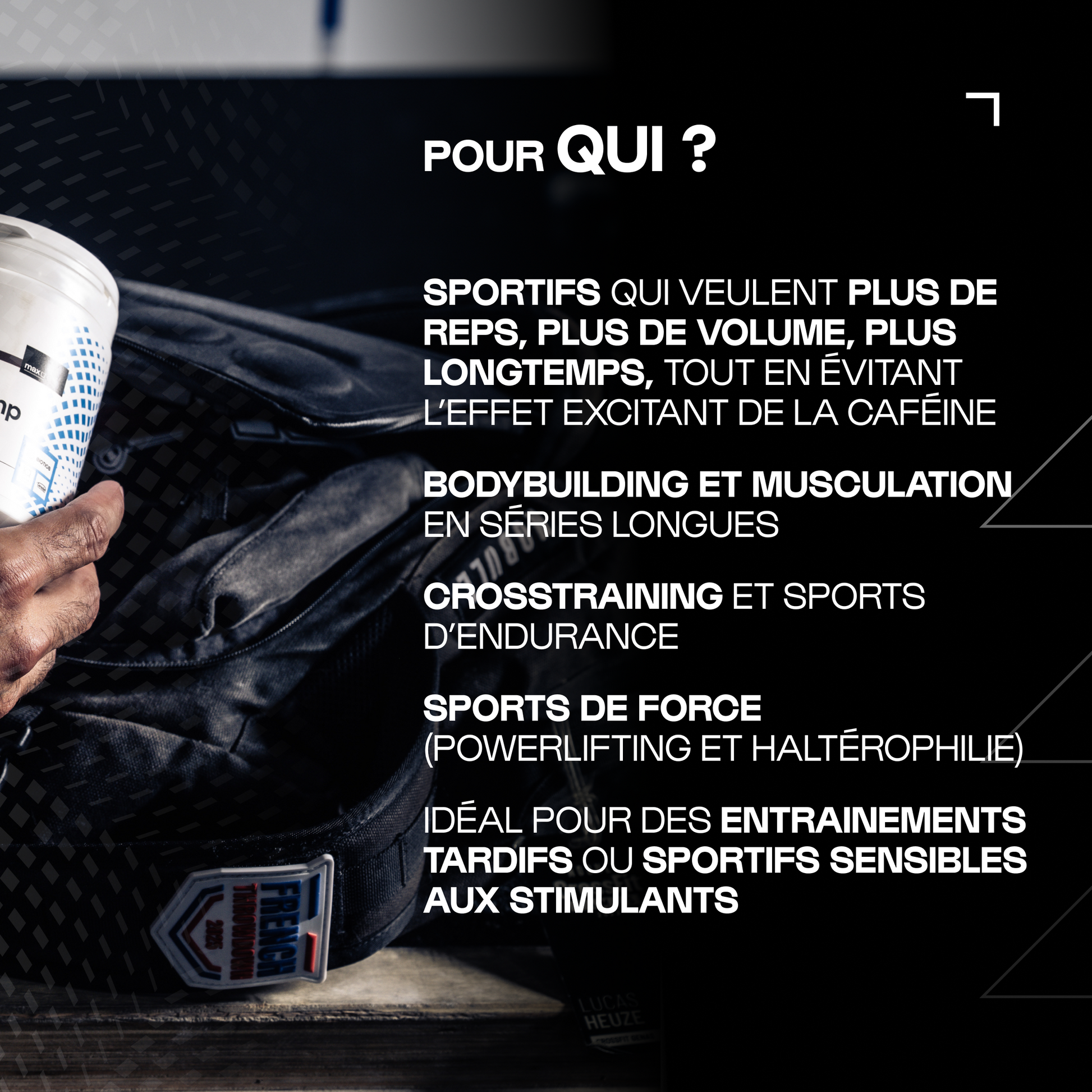 Le MusclePump Nutrimuscle s’adresse aux sportifs qui souhaitent faire plus de répétitions, plus de volume et plus longtemps, tout en évitant l’effet excitant de la caféine. Il convient parfaitement aux pratiquants de musculation et de bodybuilding en séries longues, aux adeptes de crosstraining et de sports d’endurance, ainsi qu’aux sportifs de force tels que les powerlifters et haltérophiles. Il est particulièrement adapté aux entraînements tardifs ou aux personnes sensibles aux stimulants.
