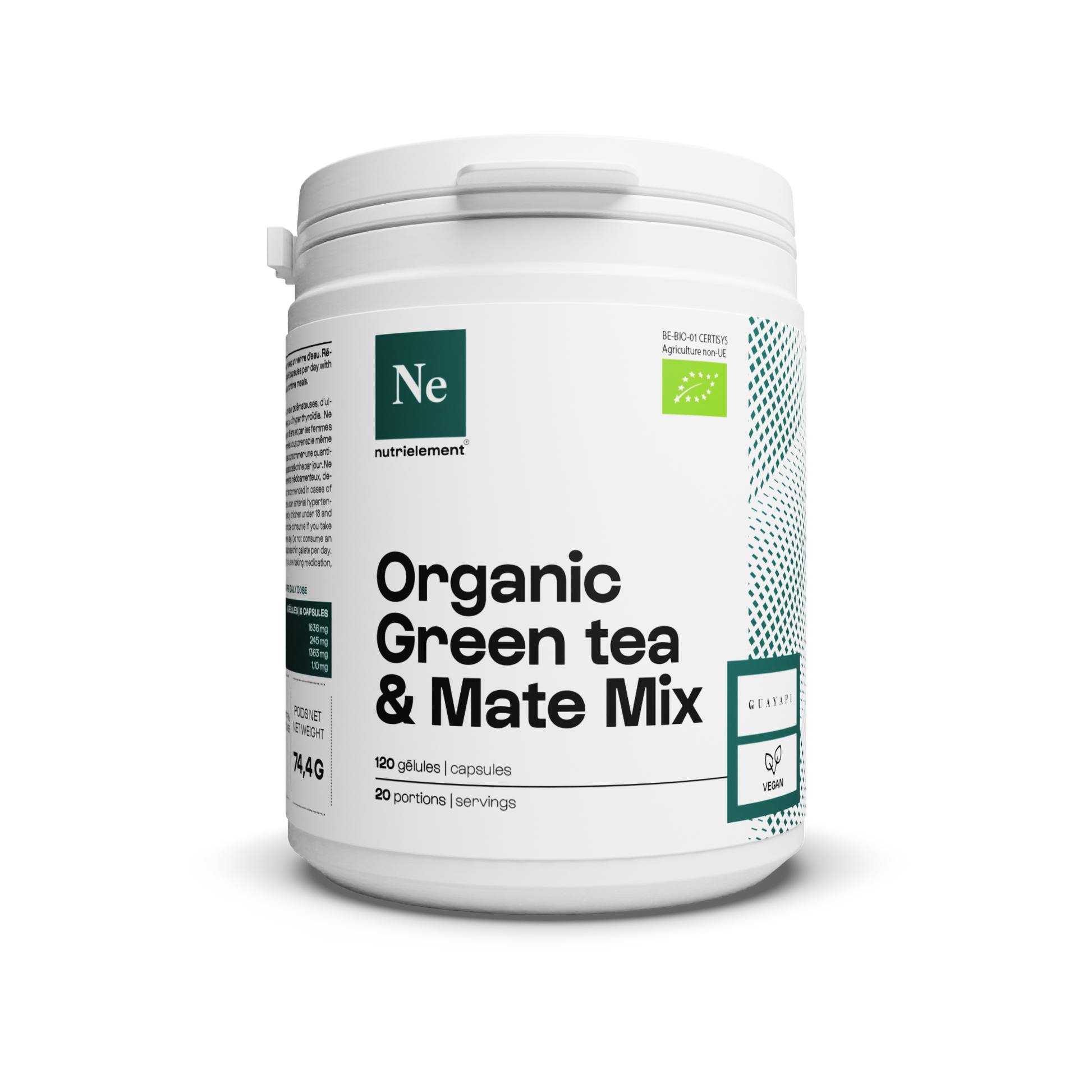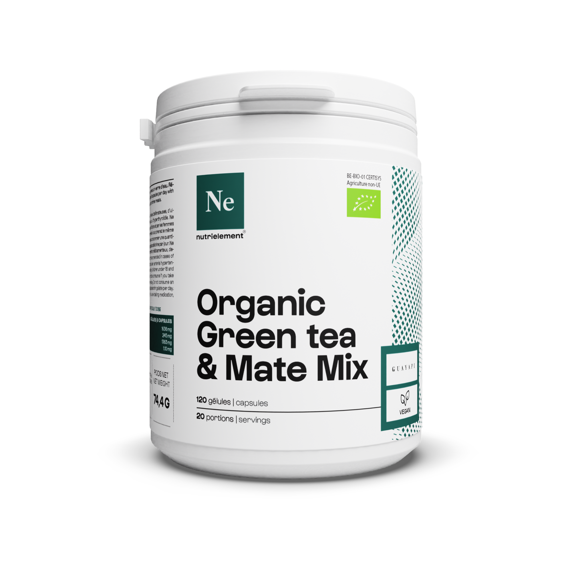 Poudre de feuille de thé vert (Camellia sinensis) biologique, poudre de feuille de maté (Ilex paraguariensis) biologique, gélule végétalienne (agent d’enrobage : hydroxypropylméthylcellulose)… et c’est tout.