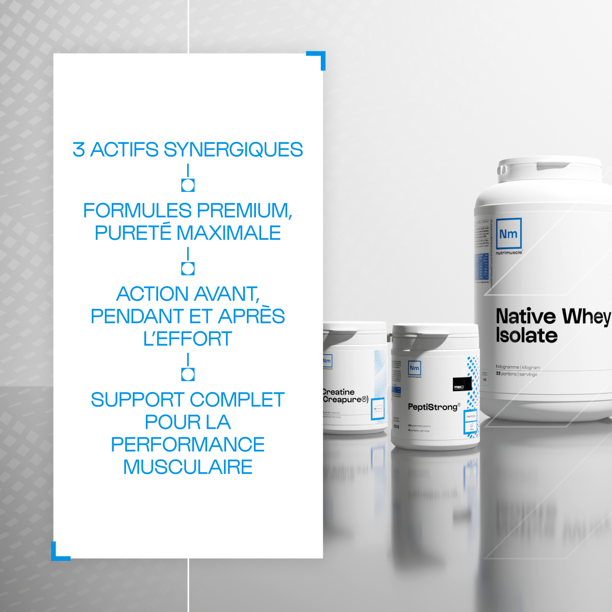 Le Trio Perf’ Ultime Nutrimuscle réunit trois formules de pointe pour un seul objectif : la performance totale. Grâce à la synergie entre la Créatine Creapure®, l’Isolate Native Whey et le PeptiStrong®, ce trio agit à tous les niveaux du développement musculaire : énergie, anabolisme et régénération. Les ingrédients utilisés sont premium, brevetés et rigoureusement sélectionnés pour leurs effets prouvés sur la performance et la synthèse protéique.