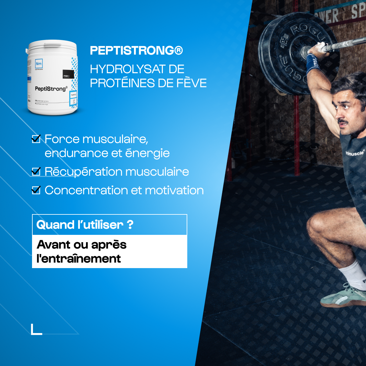 Le PeptiStrong®, hydrolysat végétal breveté à base de peptides de fève, soutient la force, l’endurance et l’énergie tout en accélérant la récupération musculaire. Il améliore également la concentration et la motivation, pour des séances plus intenses et plus efficaces.